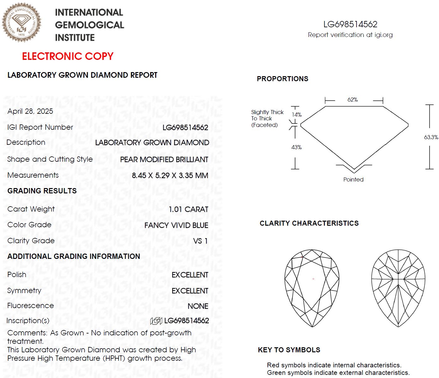 1 CT Blue Pear Lab Grown Diamond For Engagement Ring - IGI Certified VS1